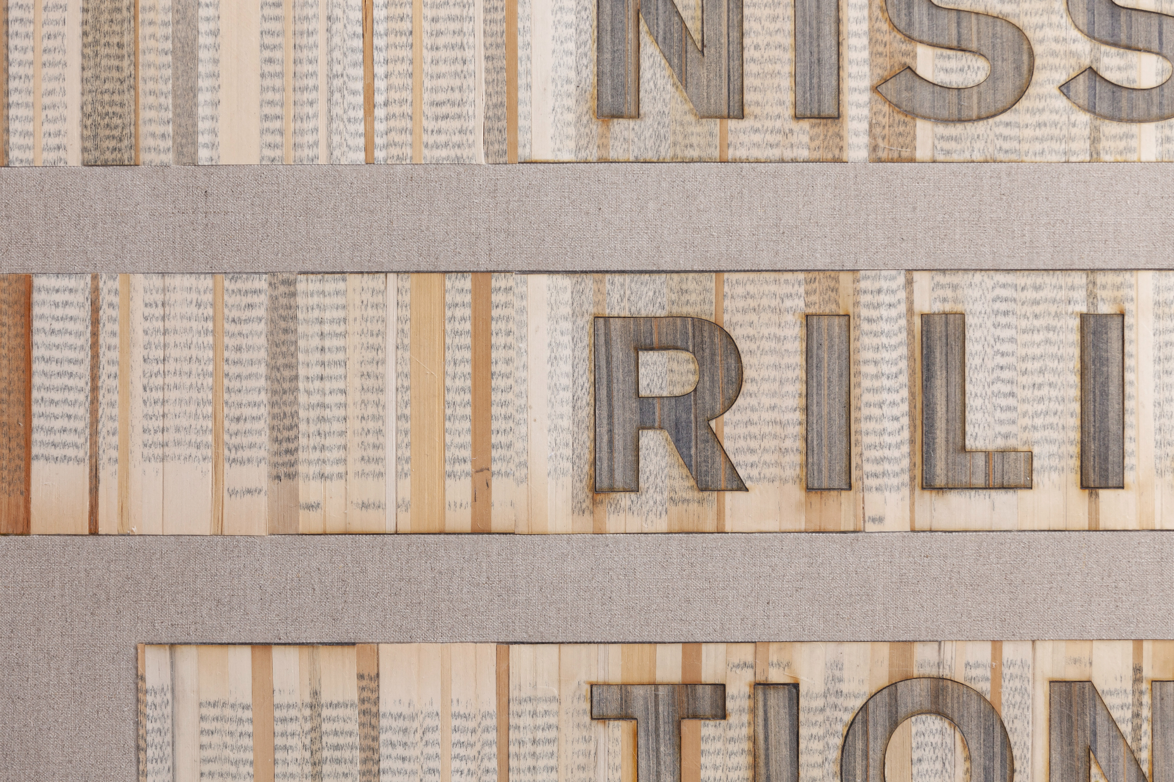 The edges of pages of Brave New World by Aldous Huxley are cut into letterforms, and inset into a canvas wrapped wood panel. The piece is protetcted with an archival UV finish.