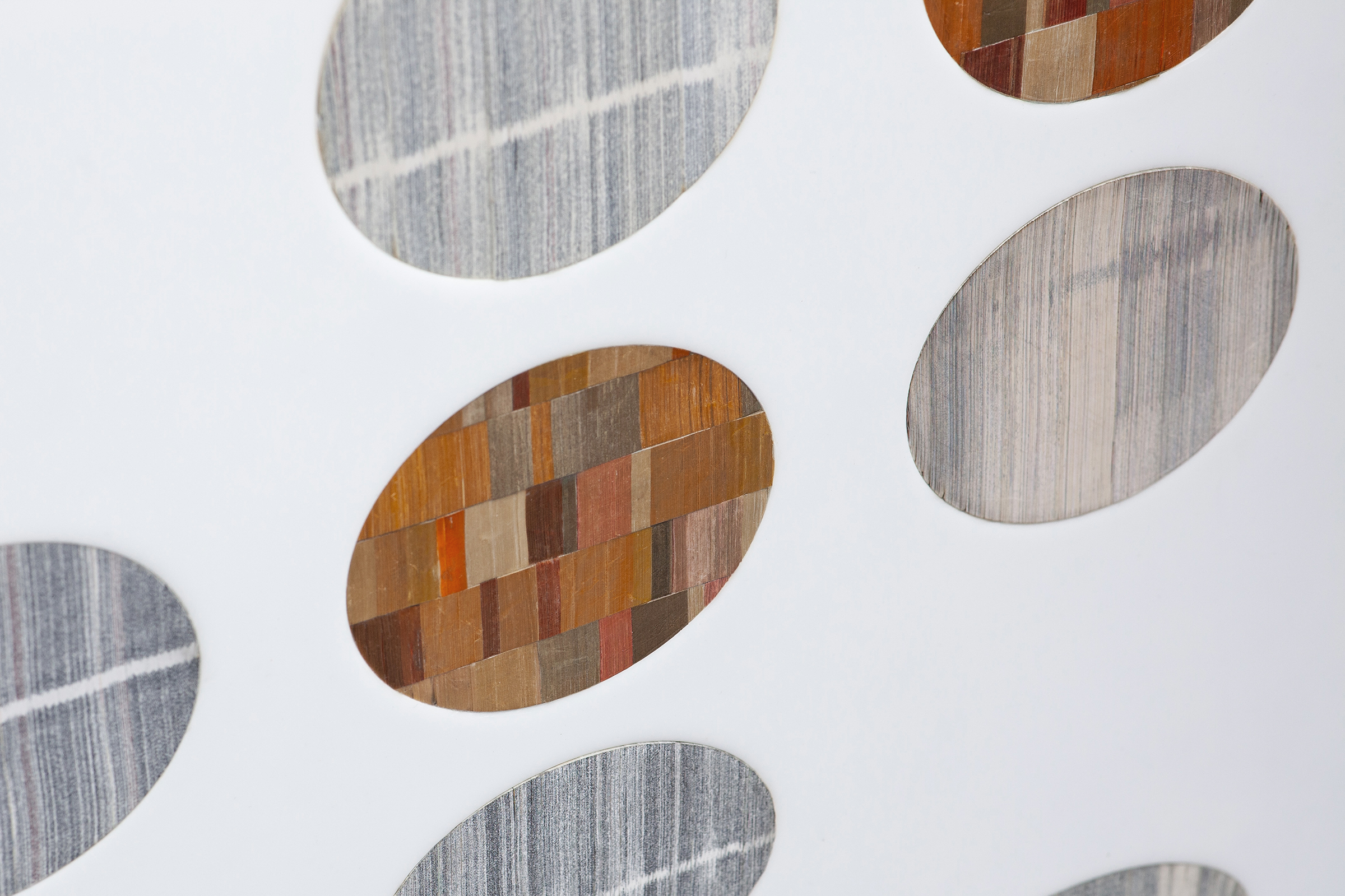 The edges of Bible pages (interior, and gold gilding) are inset into a wood panel. The white acrylic area is coated with resin, and the entire piece is finished in an archival UV matte coating.