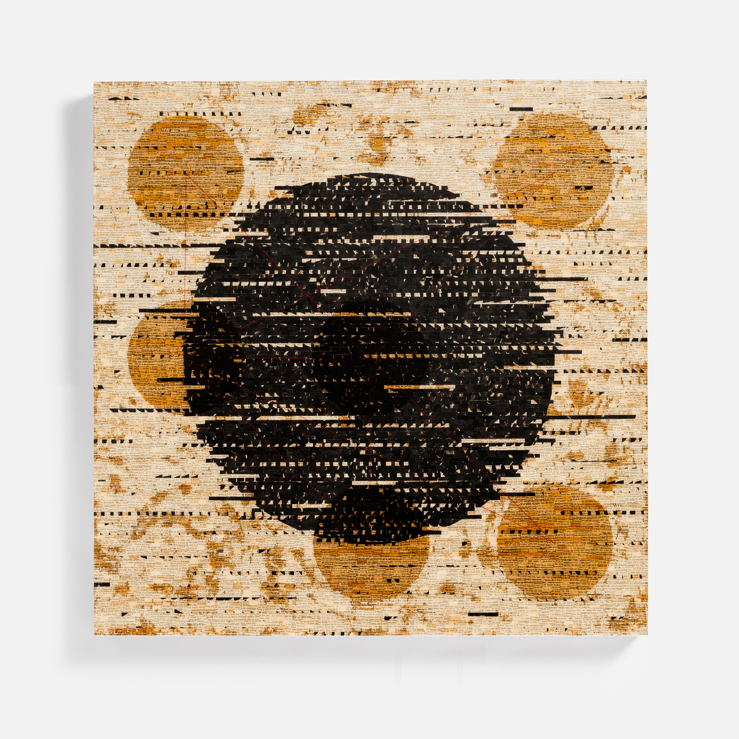 After painting a circle on every page of a vintage book, the pages are cut up and rearranged. With thread and acrylic, coated in high gloss resin on wood panel.