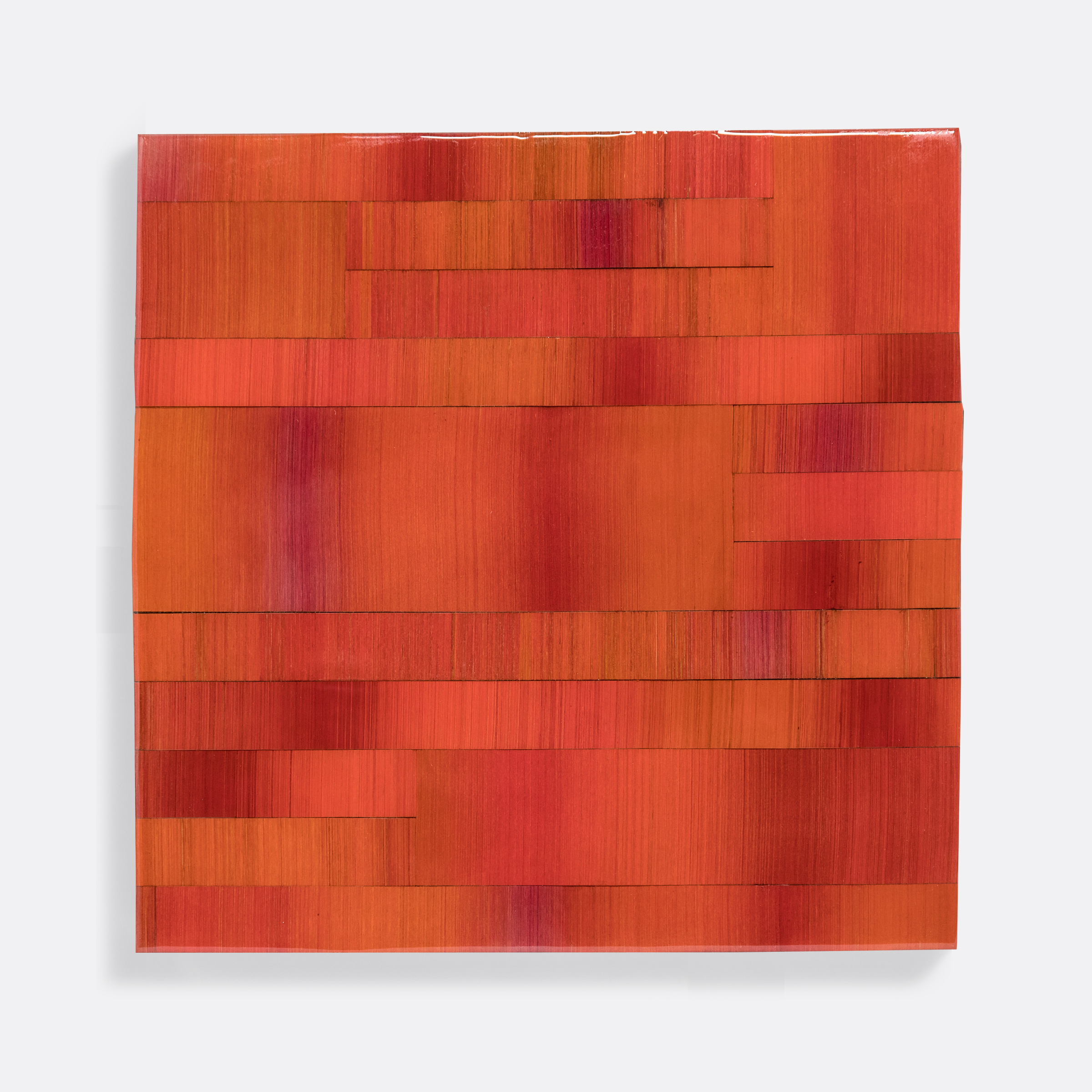 Old paperback books are cut and then sorted into gradation patterns using the red edges of the paper. Finished with a high-gloss UV resin.