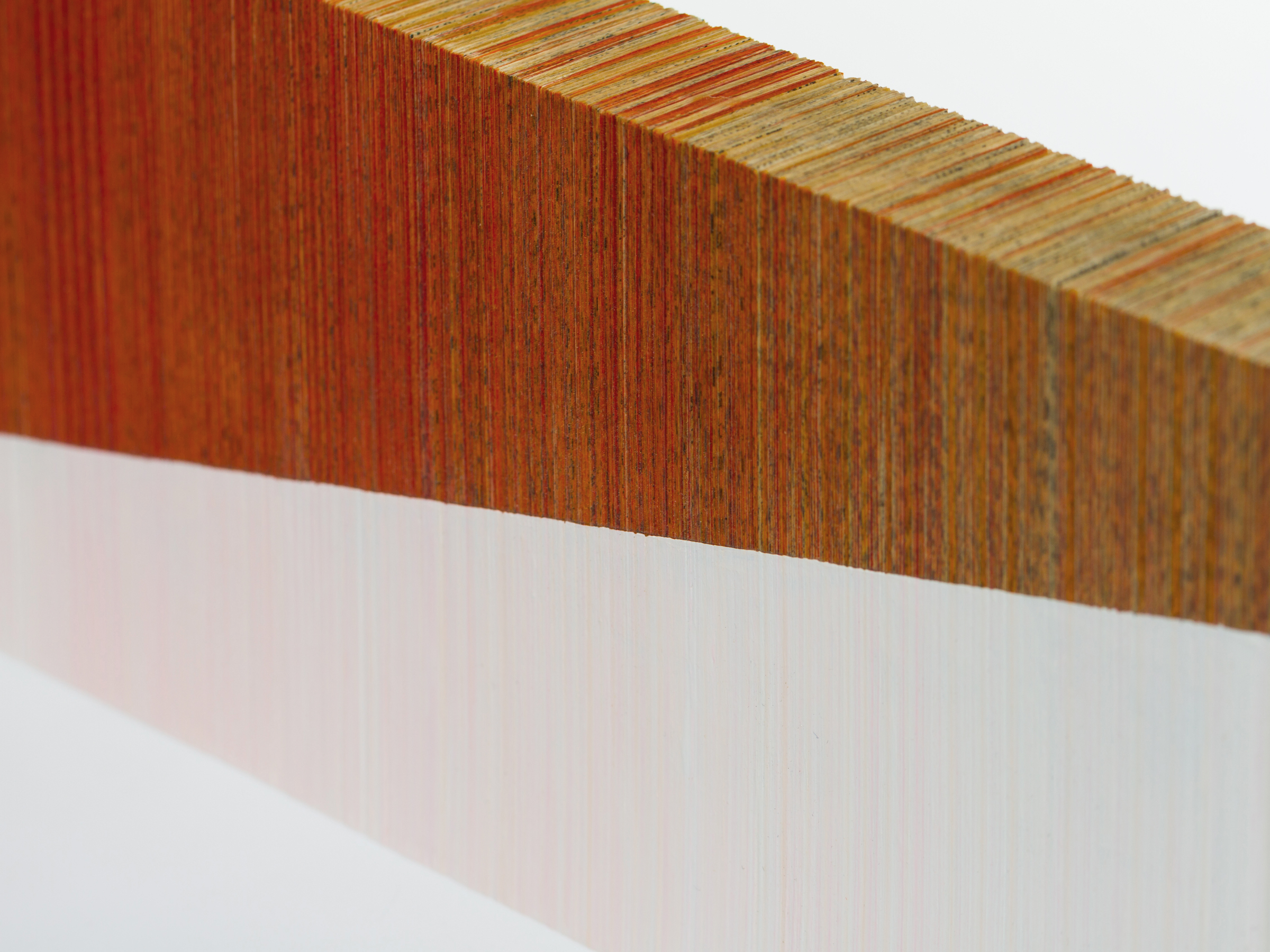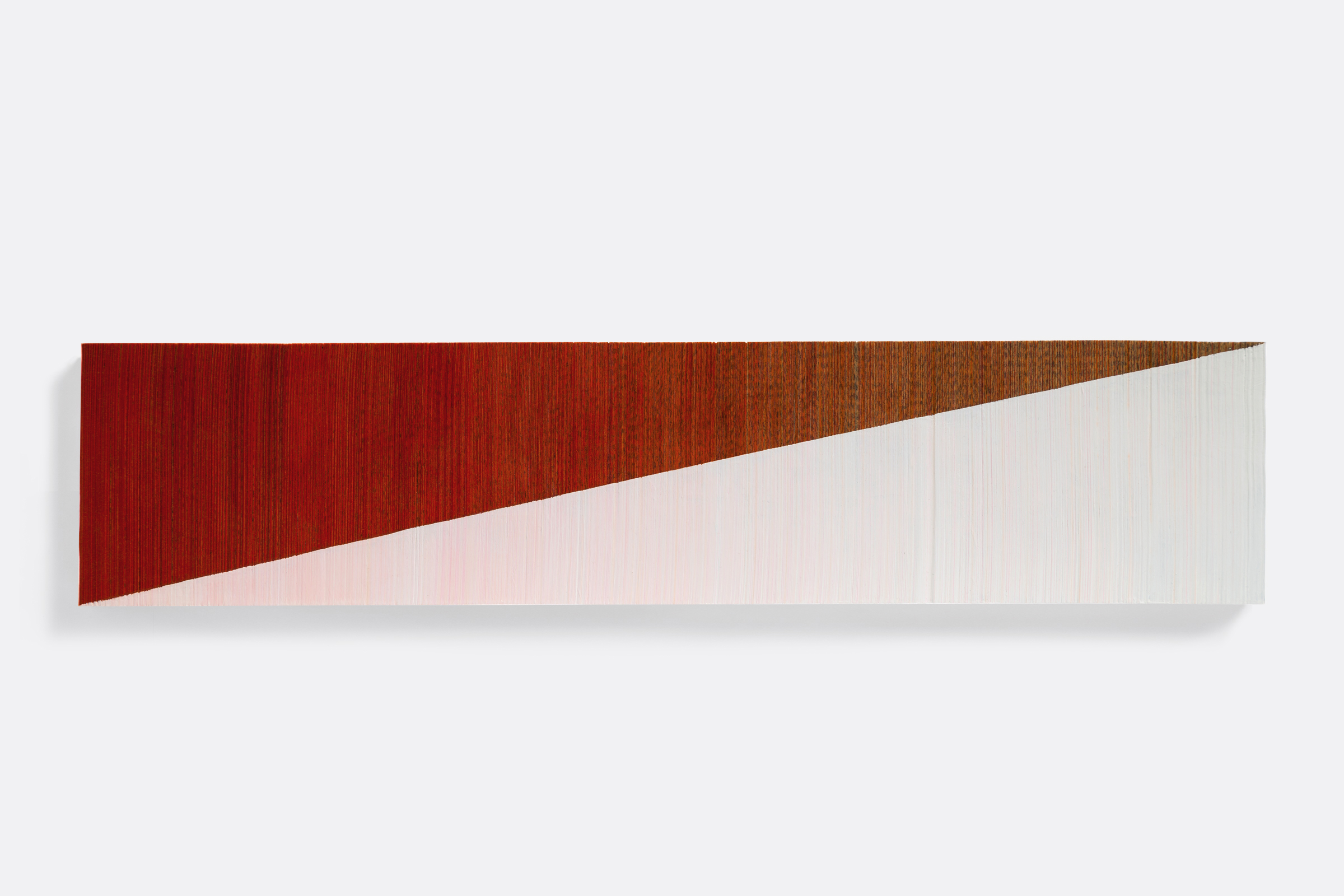 Paperback books are cut and then sorted into gradation patterns using the edges of the paper. Acrylic paint is added to form geometric shapes.