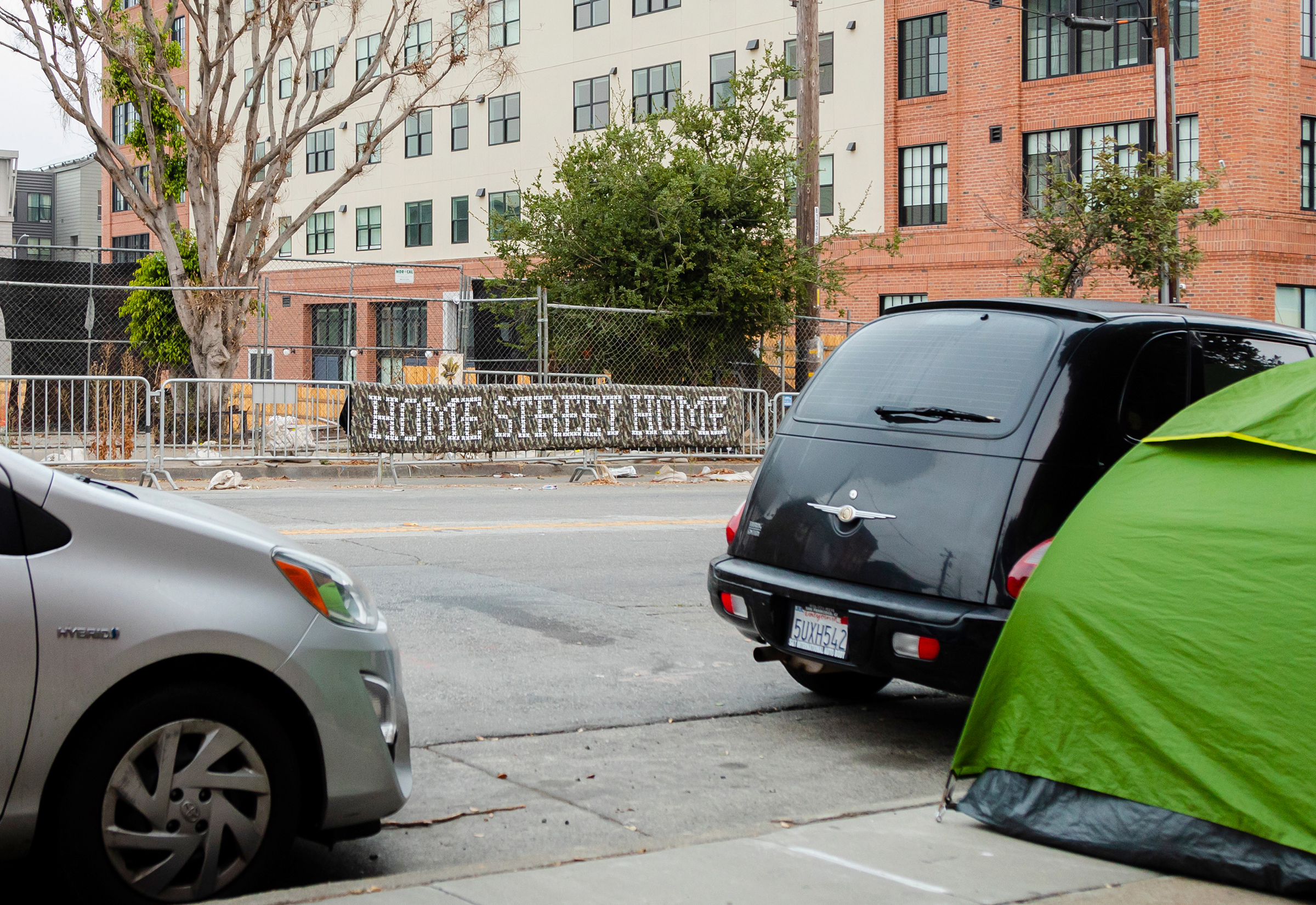 Aimed at raising awareness of the rising number of unhoused people in San Francisco, this series of installations has taken several forms over the years. From sleeping bags intended to be taken by those who need them, to laser-cut plastic on chain-link fences.