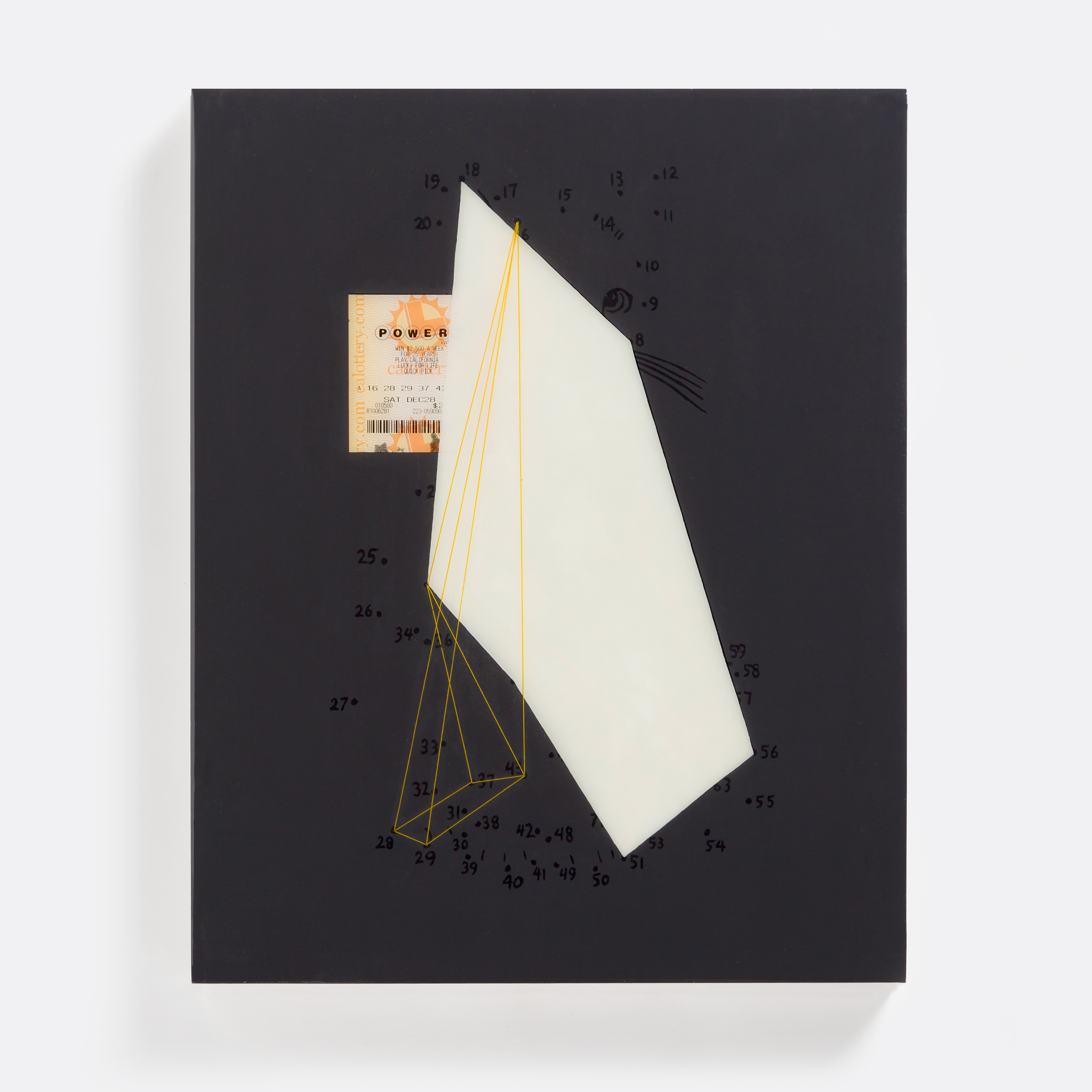 Acrylic and thread on wood panel. On the backdrop of a black cat "connect the dots" image, the numbers from a lottery drawing are plotted. Ticket numbers are painted, winning numbers are in thread.