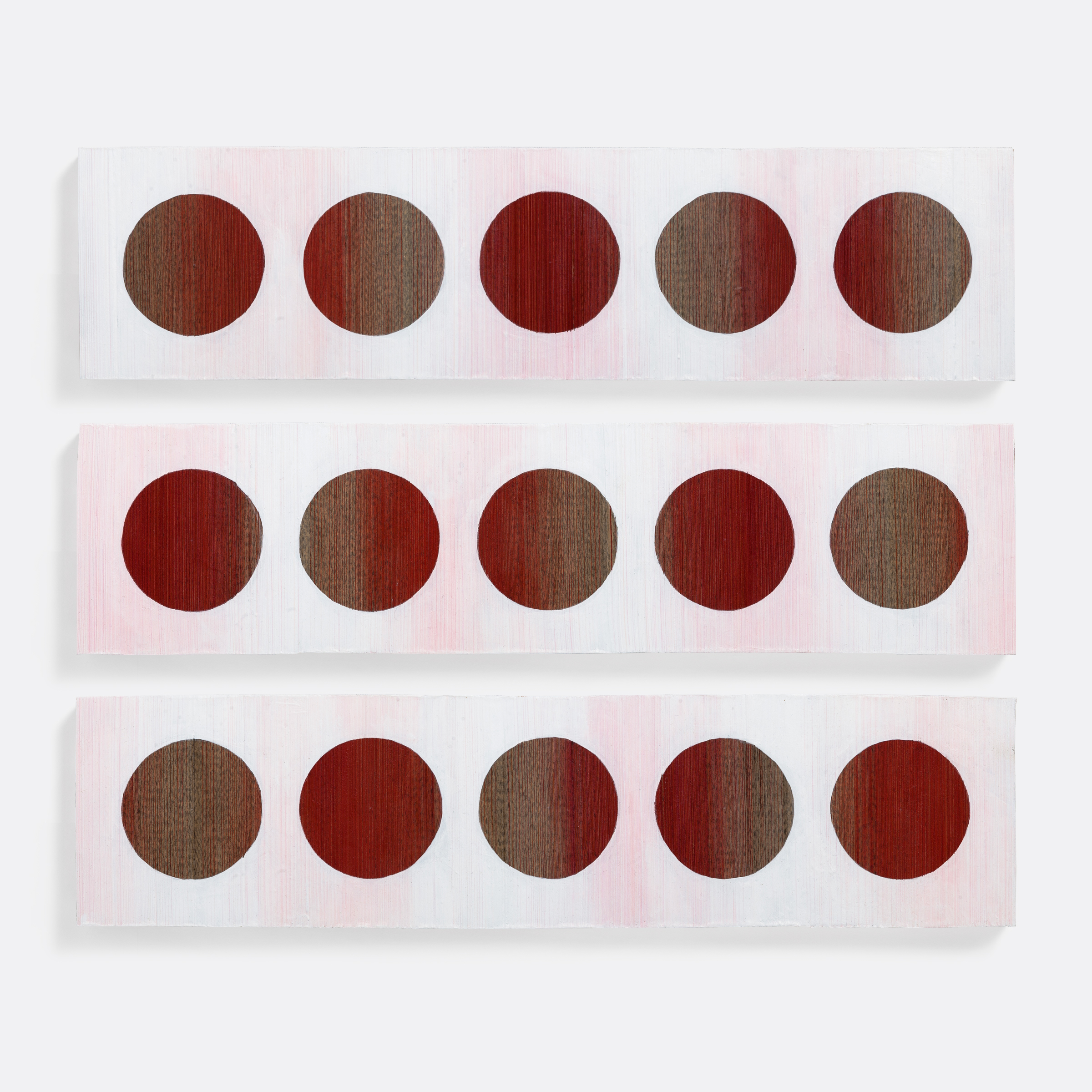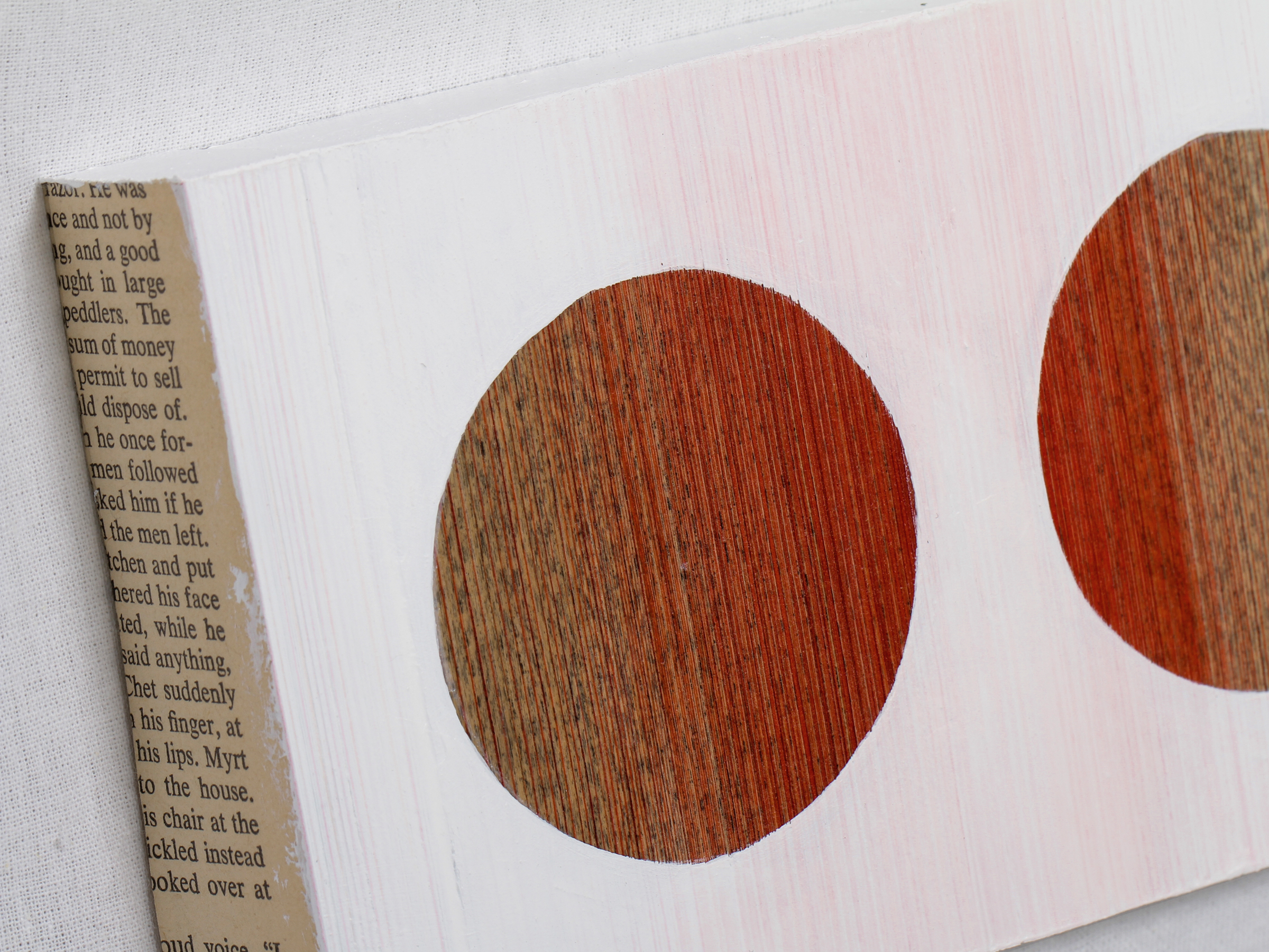 Paperback books are cut and then sorted into gradation patterns using the edges of the paper. Acrylic paint is added to form geometric shapes.