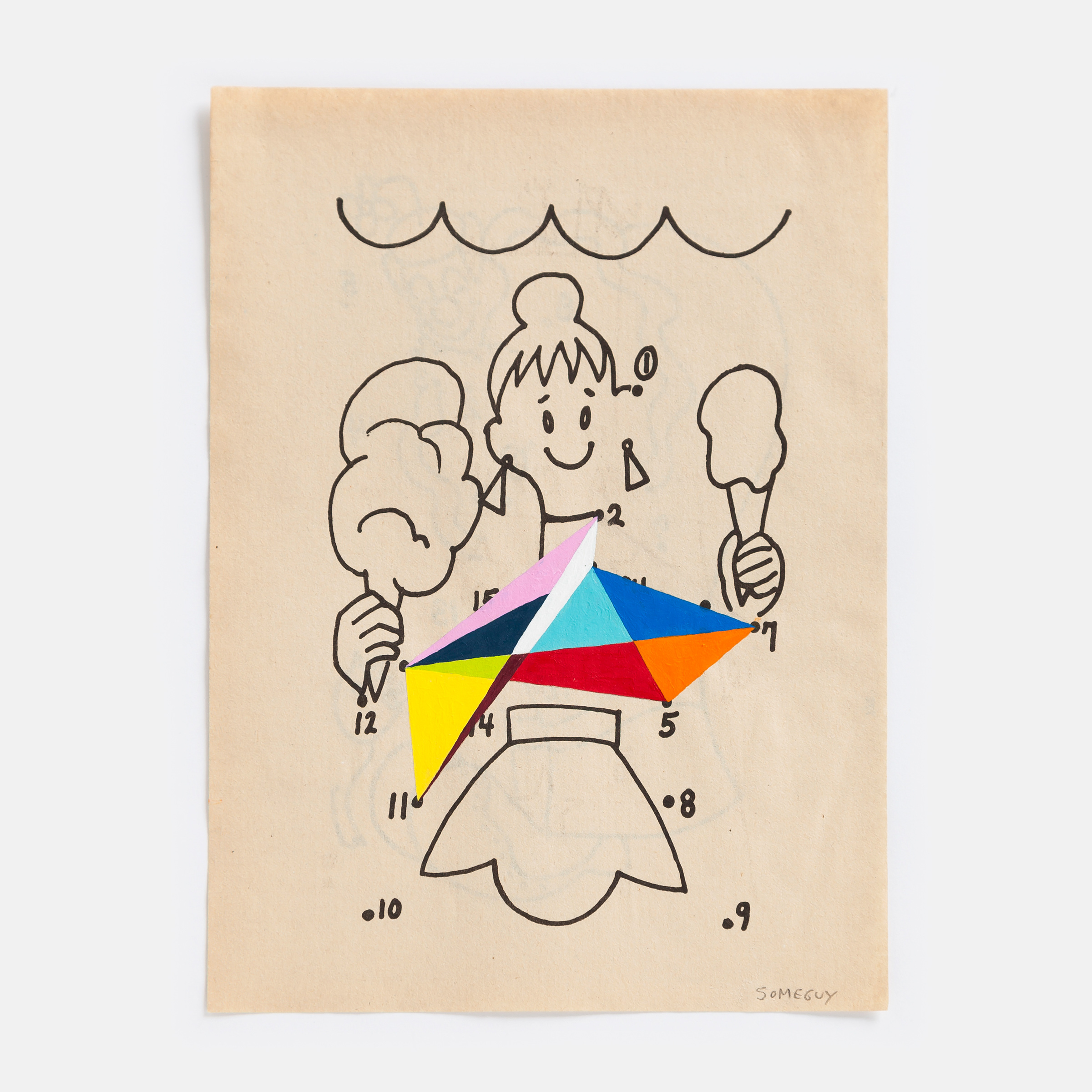 Acrylic on vintage "connect the dots" coloring book. Prime numbers are connected, revealing an alternate visual to the expected form.