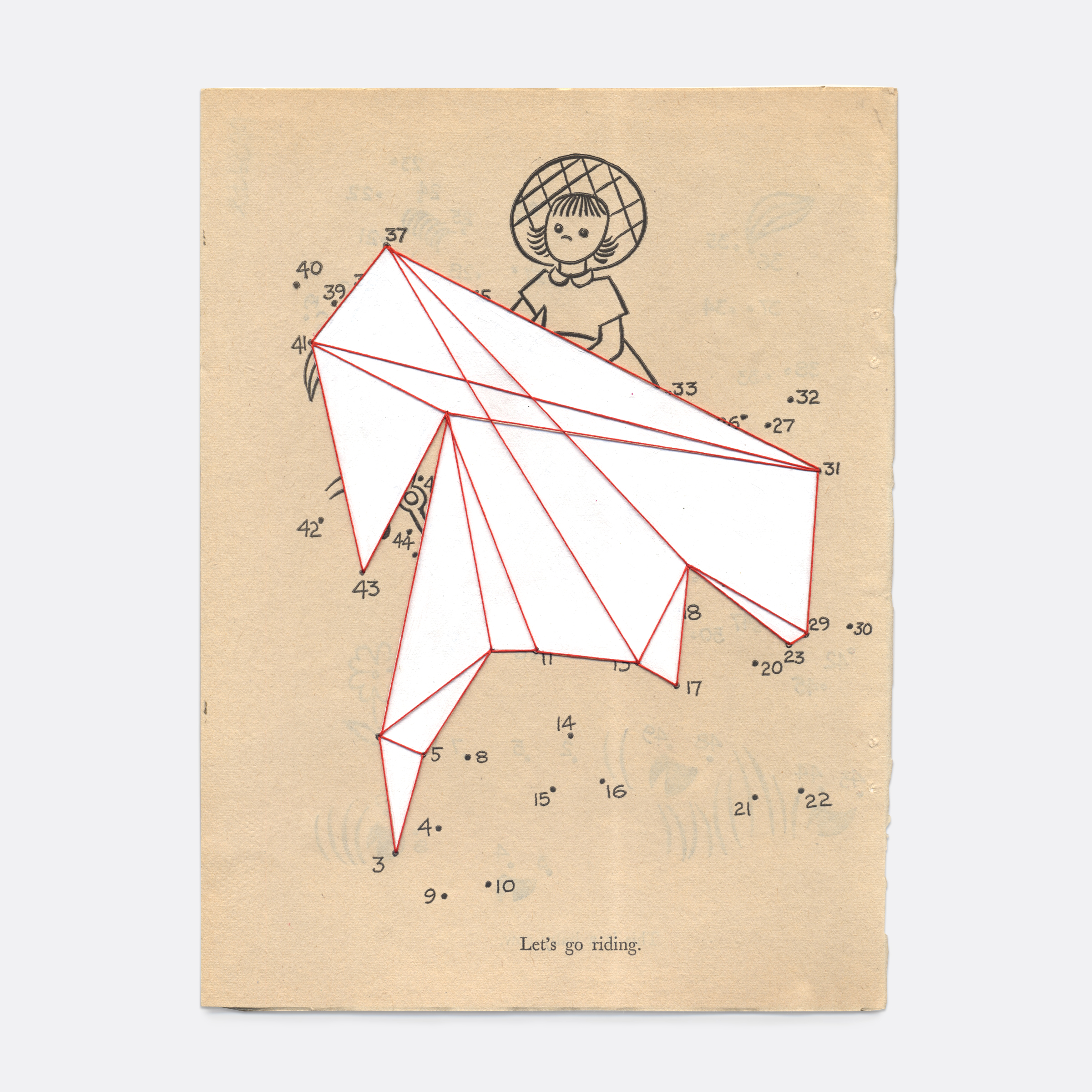 Acrylic and thread on vintage "connect the dots" coloring book. Prime numbers are connected, revealing an alternate visual to the expected form.