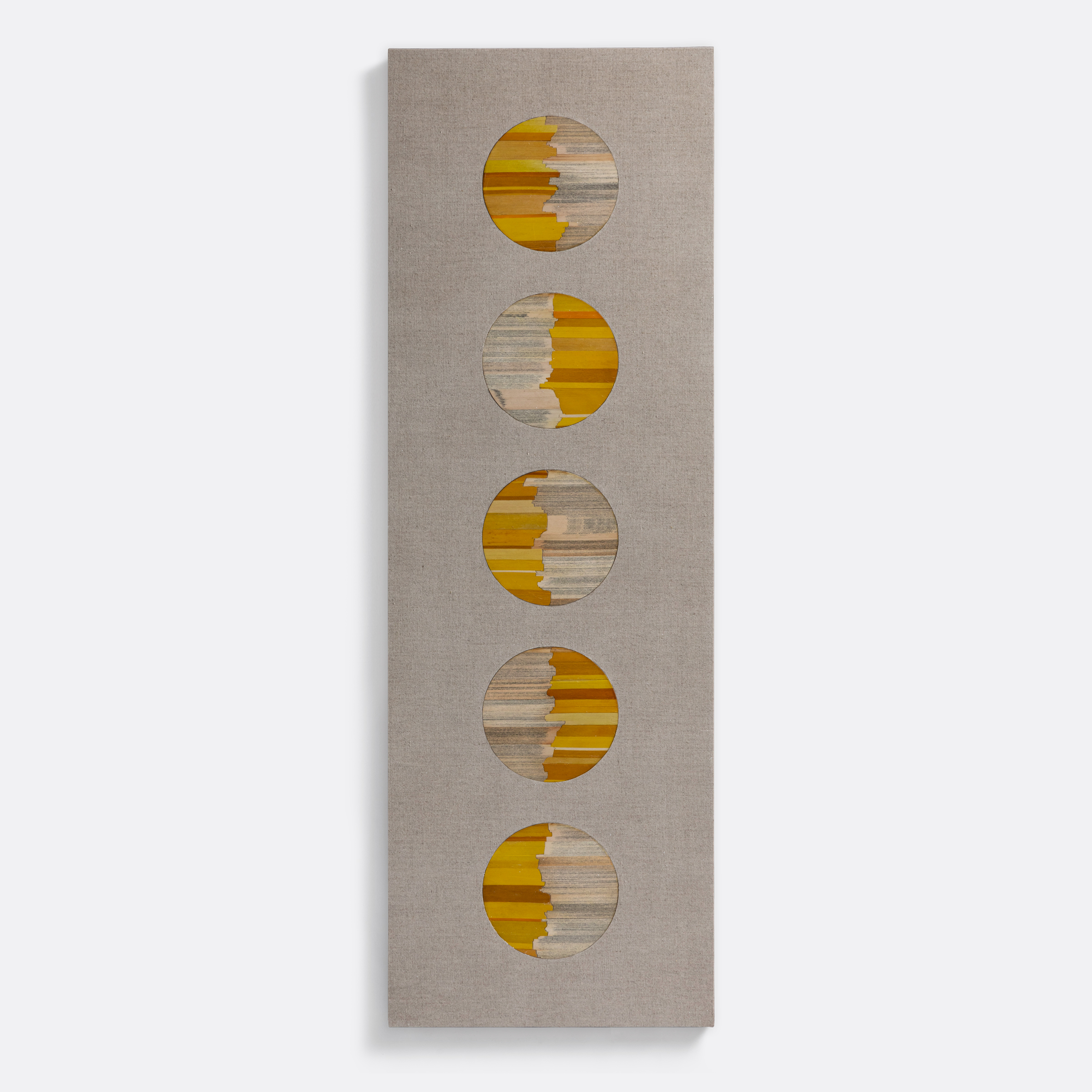 The cut edges of book pages are arranged into patterns and then inset into a wood panel wrapped in Belgian linen canvas. The piece is protected with an archival UV finish.