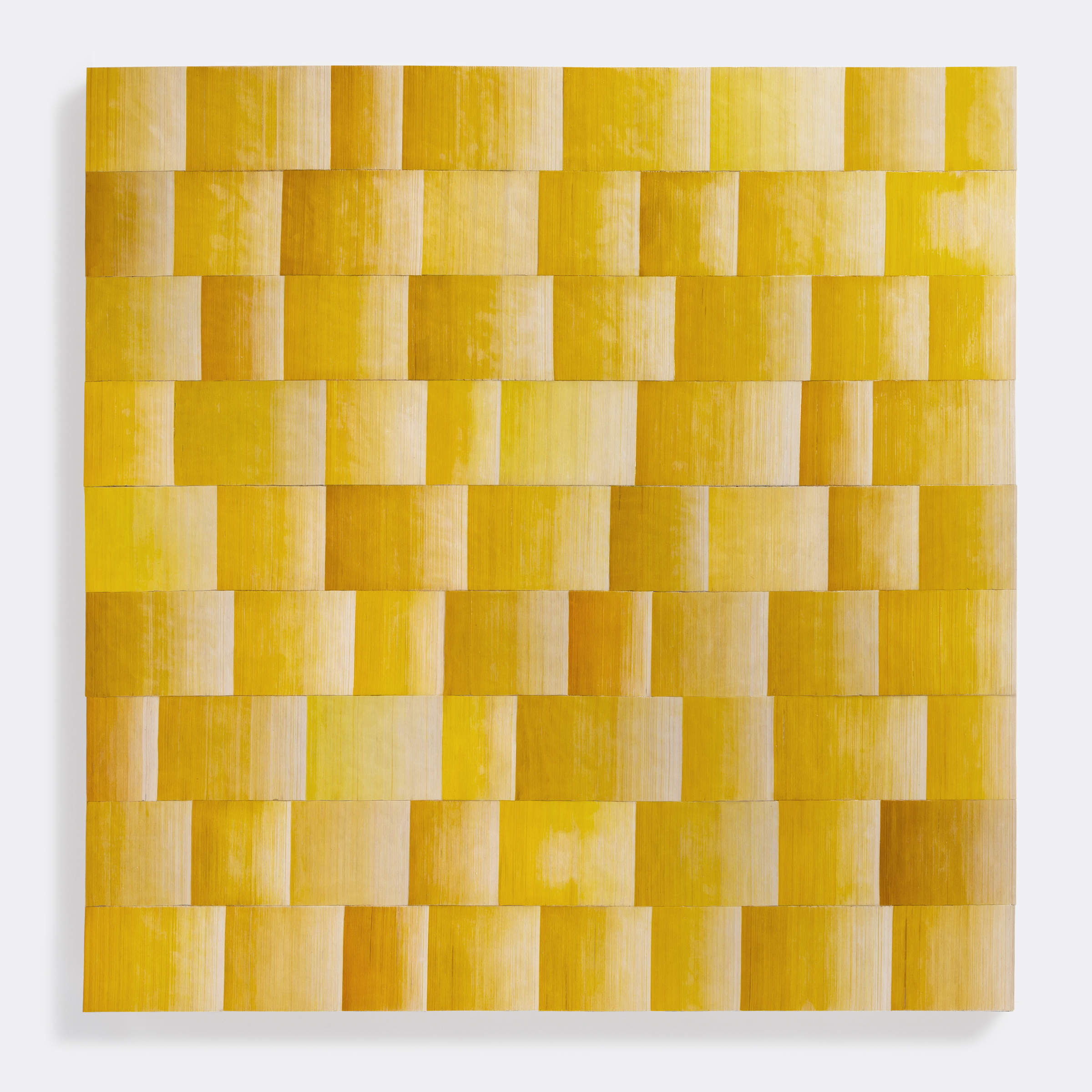 Paperback books are cut and then sorted into patterns using the edges of the paper. The piece is coated in an archival UV acrylic finish.